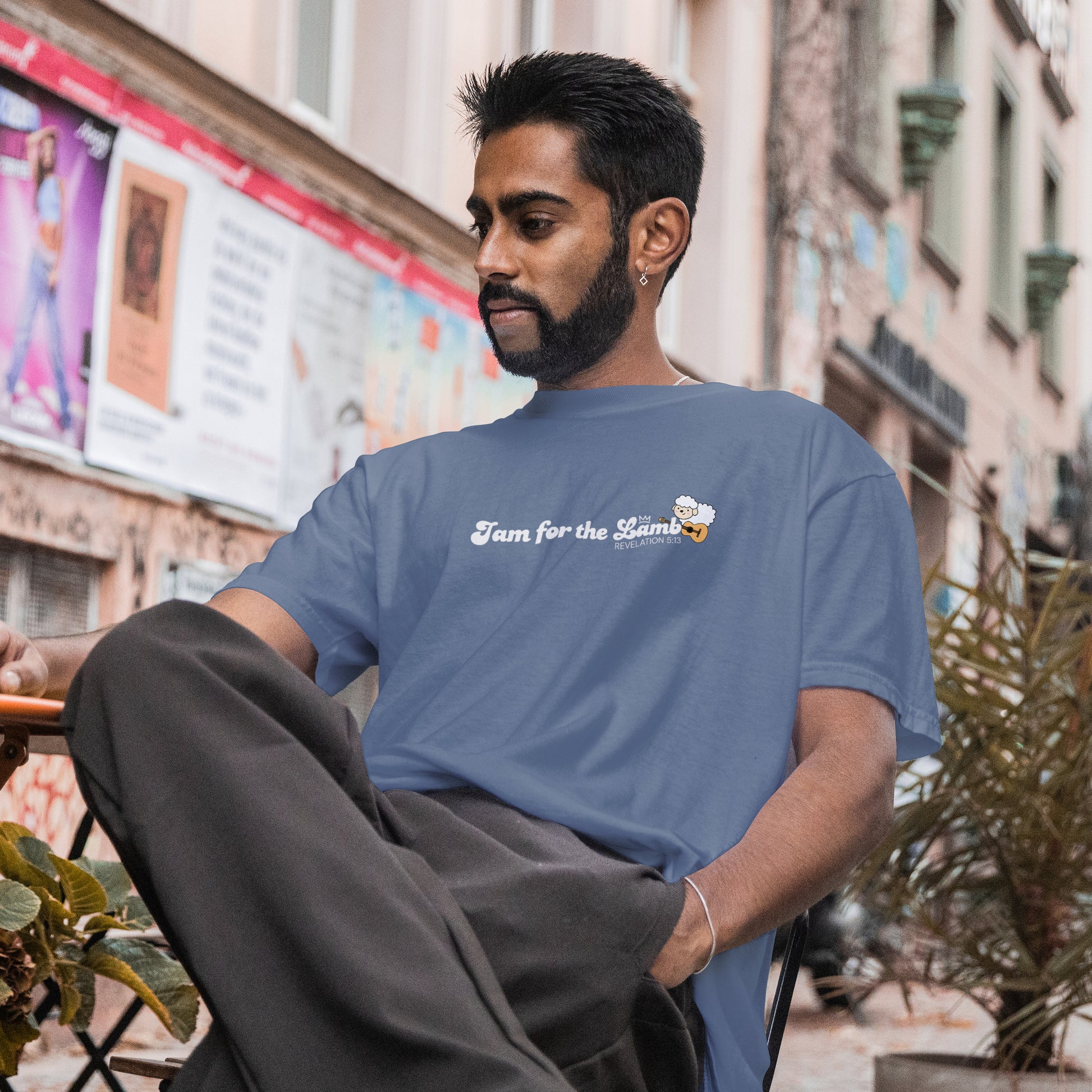 Comfort Color Blue Jean color shirt with Jam For The Lamb font logo on the front with Revelation 5:13 on the back.