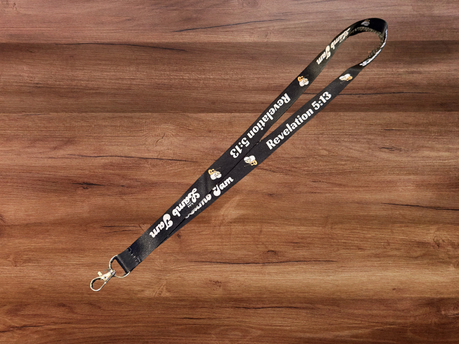Black Lobster Clip Custom Lanyards with Lamb Jam Font Logo, Sheep Logo, and Revelation 5:13.