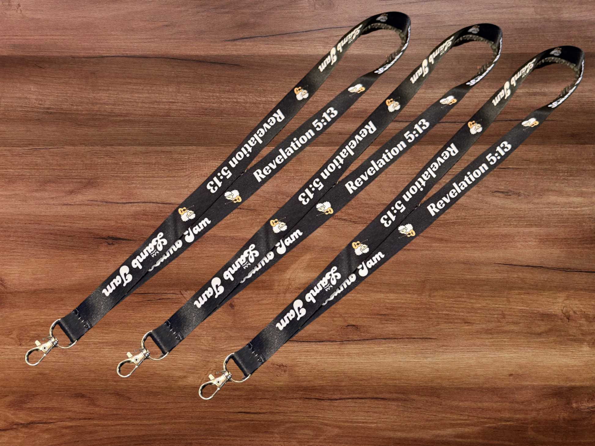 Get yourself 3 lanyards at a discount! Give one away if you'd like! 3 Black Lobster ClipCustom Lanyards with Lamb Jam Font Logo, Sheep Logo, and Revelation 5:13.